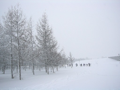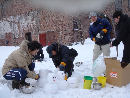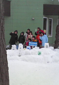 モエレ沼公園のモエレ山には今日もたくさんの子どもたちが、 上に登ってはソリ遊びをしています。 雪ダルマも肩をよせあってます。 |