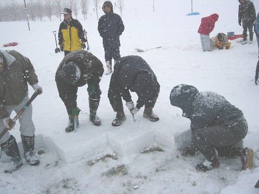 踏み固めた雪をブロック状に切り出します。 スノーソーを使って縦に横に。 「あ〜あ、誰だこの曲がったラインは・・・」 そんな声があちこちから聞こえてきます。 写真のグループは手慣れた手つきでラインが真っ直ぐ! かっこいい大人の男の仕事です。 「いつもの仕事のようにやればいいか〜」 そんな声も聞こえてきました。 |