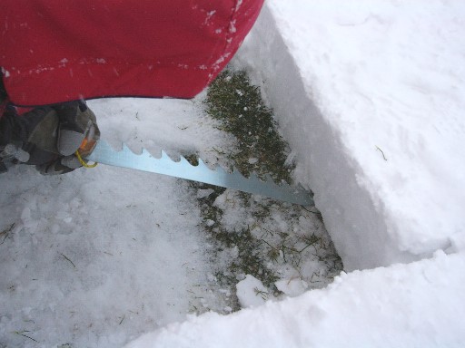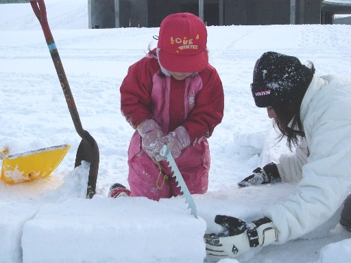 ブロックを螺旋状に並べていくと、隙間があいてしまいます。 スノーソーで左右の面を削ります。 子どもだって、大人が側についてあげれば大丈夫。 きれいな台形ブロックになったかな? |