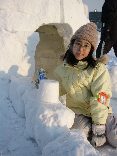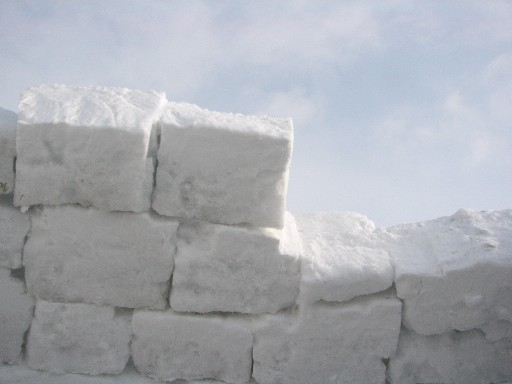 下の段のブロックと切れ目が互い違いになるように積まれています。 2段目以降は内側に内側に傾くようにうまく積んでいくと、 こうなります。入口もきちんと出来てます。 |