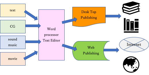 近年のワープロは,インターネットのホームページの形式であるhtml形式で保存する機能が追加されてきました.ワープロを使ってホームページを作成して,完成した文書などを広くインターネットを使って公開することができます.WWW(World Wide Web,広く世界に広がった蜘蛛の巣)の世界に電子的に出版することをWeb Publishingといいます.