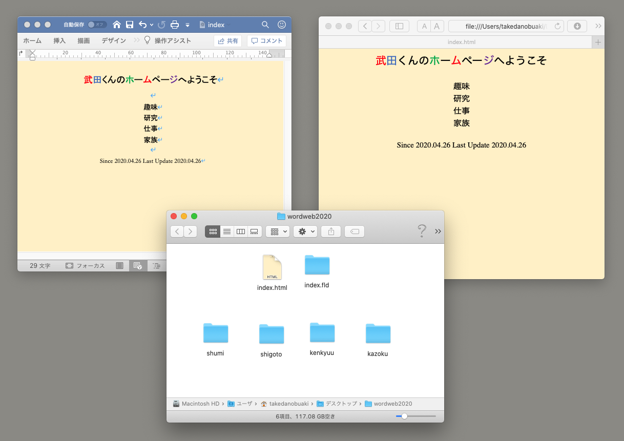 作業は,ワード画面を表示しながら,保存先フォルダの内容を確認しながら,ブラウザ上で出来上がりを見ながら行うと分かりやすいです.